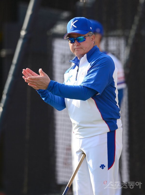 김경문 감독이 선수들의 타격 훈련 때 박수를 쳐주고 있다.