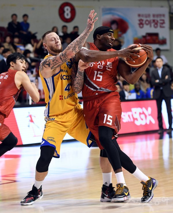 20일 경기도 안양실내체육관에서 열린 ‘2019-2020 현대모비스 프로농구’ 안양 KGC와 서울 삼성의 경기에서 KGC 브라운이 삼성 미네라스와 볼 다툼을 벌이고 있다.