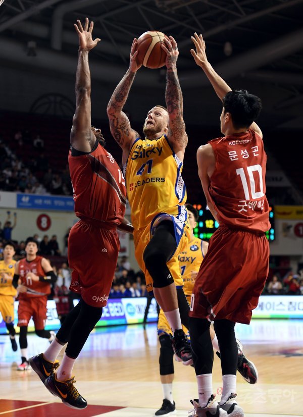 20일 경기도 안양실내체육관에서 열린 ‘2019-2020 현대모비스 프로농구’ 안양 KGC와 서울 삼성의 경기에서 삼성 미네라스가 KGC 수비를 피해 슛을 쏘고 있다.