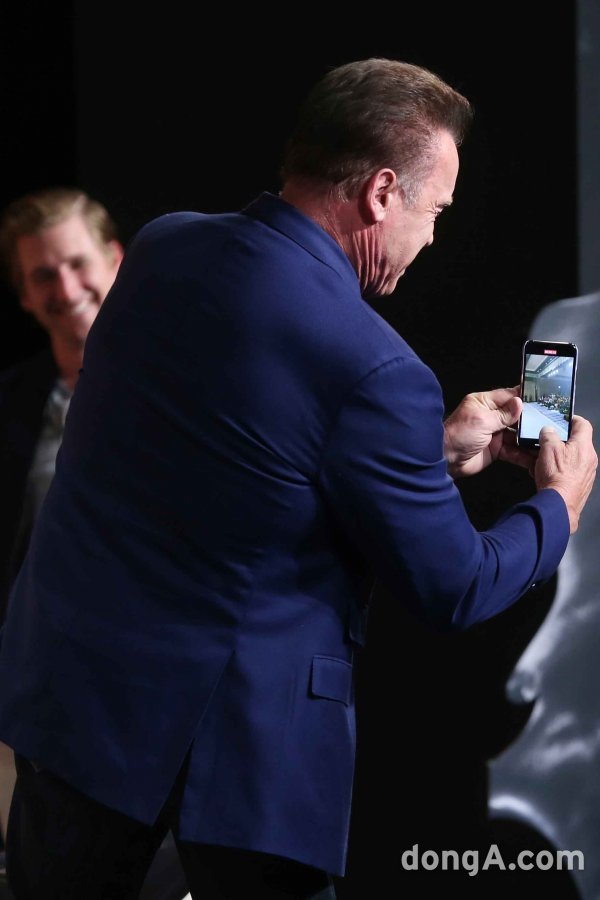 할리우드 배우 아놀드 슈왈제네거가 21일 오전 서울 종로구 포시즌스호텔에서 열린 외화 \'터미네이터 다크페이트\' 내한기자회견에서 취재진의 모습을 휴대폰에 담고 있다.
