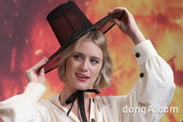 할리우드 배우 맥켄지 데이비스가 21일 오전 서울 종로구 포시즌스호텔에서 열린 외화 \'터미네이터 다크페이트\' 내한기자회견에서 갓을 쓰고 있다.