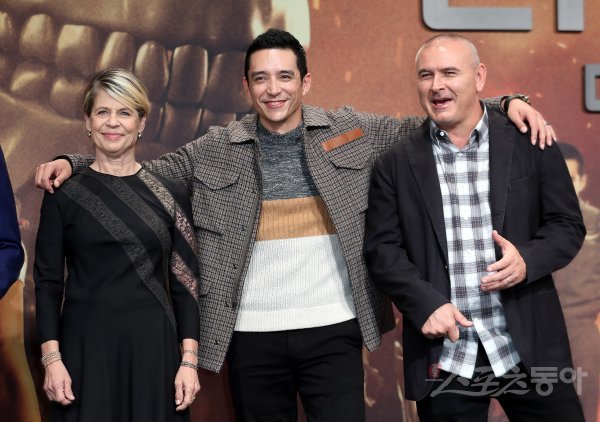 배우 린다 해밀턴과 가브리엘 루나, 팀 밀러 감독(왼쪽부터)이 21일 서울 종로구 포시즌스 호텔 서울에서 열린 영화 ‘터미네이터 : 다크 페이트’ 내한 기자회견에서 포즈를 취하고 있다.