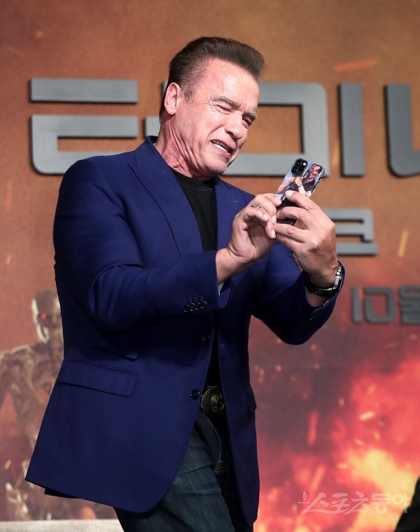 배우 아널드 슈워제네거가 21일 서울 종로구 포시즌스 호텔 서울에서 열린 영화 ‘터미네이터 : 다크 페이트’ 내한 기자회견에서 스마트폰으로 취재진의 촬영 모습을 동영상으로 담고 있다. 아널드 슈워제네거의 아이폰11의 케이스는 자신의 출연작 ‘코만도’의 바주카포를 들고 있는 모습을 형상화 했다.