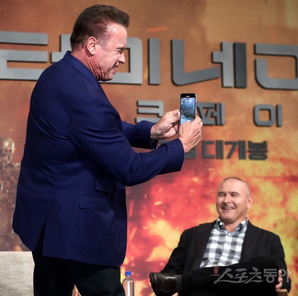 배우 아널드 슈워제네거가 21일 서울 종로구 포시즌스 호텔 서울에서 열린 영화 ‘터미네이터 : 다크 페이트’ 내한 기자회견에서 스마트폰으로 취재진의 촬영 모습을 동영상으로 담고 있다.