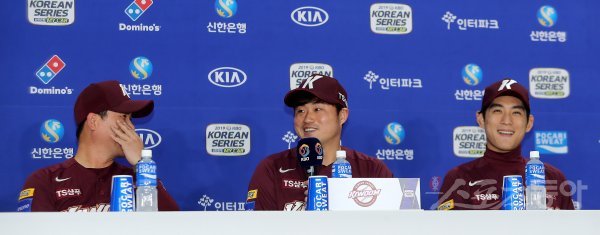 21일 서울 잠실야구장에서 ‘2019 신한은행 MY CAR KBO 포스트시즌’ 한국시리즈 미디어데이가 열렸다. 키움 장정석 감독과 이지영, 이정후가 환하게 웃고 있다.