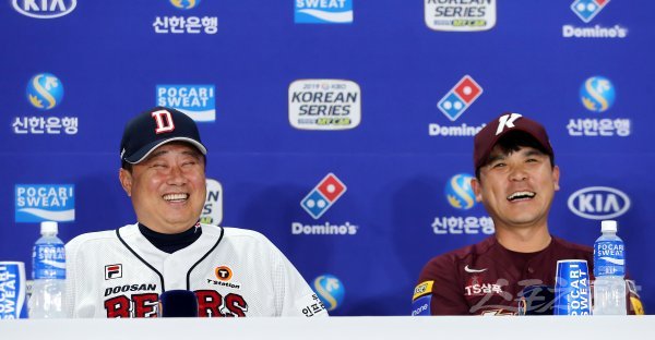 21일 서울 잠실야구장에서 ‘2019 신한은행 MY CAR KBO 포스트시즌’ 한국시리즈 미디어데이가 열렸다. 두산 김태형 감독과 키움 장정석 감독(오른쪽)이 환하게 웃고 있다.