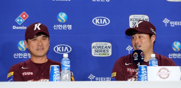 21일 서울 잠실야구장에서 ‘2019 신한은행 MY CAR KBO 포스트시즌’ 한국시리즈 미디어데이가 열렸다. 키움 이지영이 취재진의 질문에 웃으며 답변하고 있다.