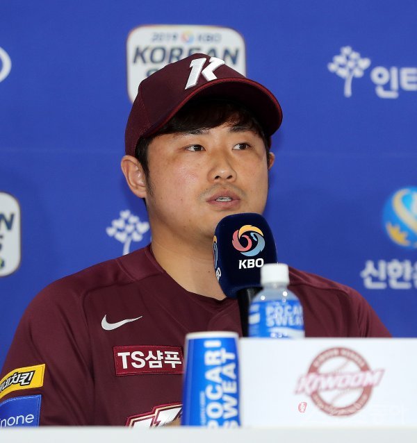 21일 서울 잠실야구장에서 ‘2019 신한은행 MY CAR KBO 포스트시즌’ 한국시리즈 미디어데이가 열렸다. 키움 이지영이 취재진의 질문에 답변하고 있다.