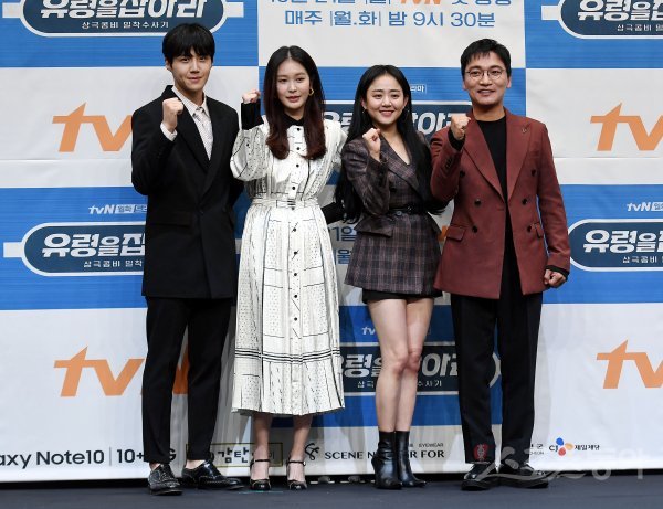 21일 서울 신도림 라마다호텔에서 열린 tvN 월화드라마 ‘유령을 잡아라’ 제작발표회에 참석한 김선호, 정유진, 문근영, 조재윤이 카메라를 향해 포즈를 취하고 있다.