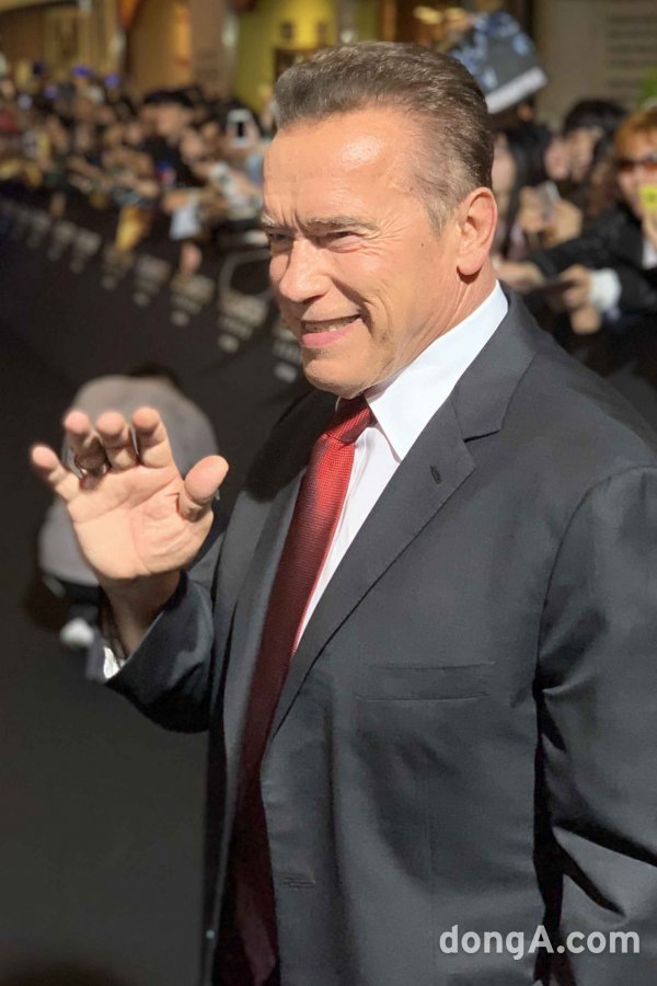 할리우드 배우 아놀드 슈왈제네거가 21일 오전 서울 영등포구 IFC몰에서 열린 외화 \'터미네이터 다크페이트\' 레드카펫 행사에서 팬들에게 인사를 하고 있다.