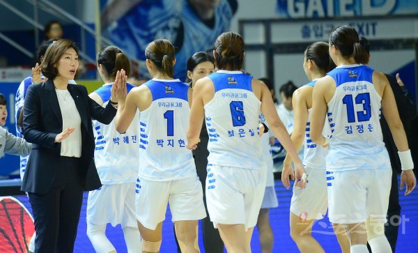 21일 경기도 용인실내체육관에서 열린 ‘하나원큐 2019-2020 여자프로농구’ 우리은행과 삼성생명 경기에서 우리은행 임영희 코치가 선수들을 격려하고 있다.