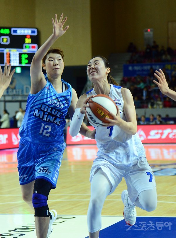21일 경기도 용인실내체육관에서 열린 ‘하나원큐 2019-2020 여자프로농구’ 우리은행과 삼성생명 경기에서 우리은행 박혜진이 삼성생명 김나연의 수비를 뚫고 골밑을 공격하고 있다.