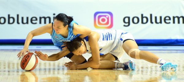 21일 경기도 용인실내체육관에서 열린 ‘하나원큐 2019-2020 여자프로농구’ 우리은행과 삼성생명 경기에서 삼성생명 김보미와 우리은행 박지현이 루즈볼을 다투고 있다.