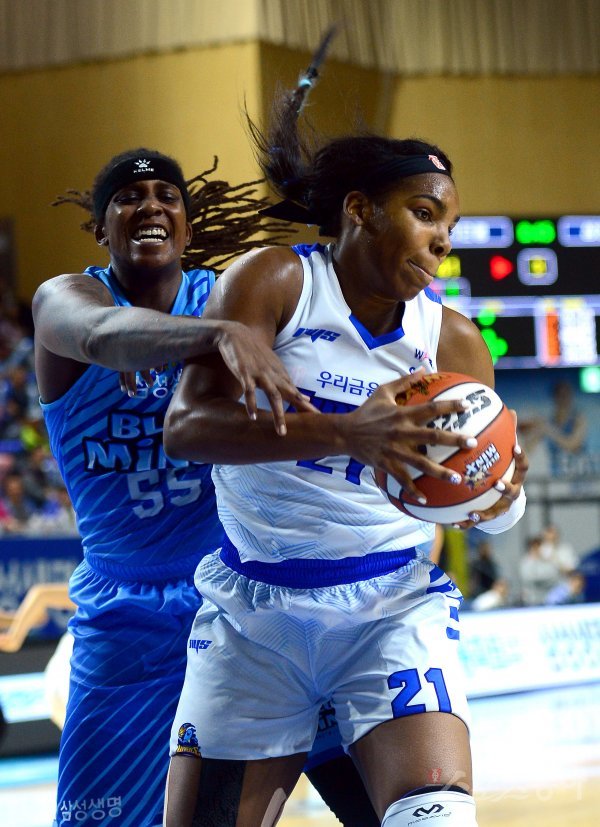 21일 경기도 용인실내체육관에서 열린 ‘하나원큐 2019-2020 여자프로농구’ 우리은행과 삼성생명 경기에서 우리은행 그레이가 삼성생명 카이저에 앞서 리바운드 볼을 잡고 있다.