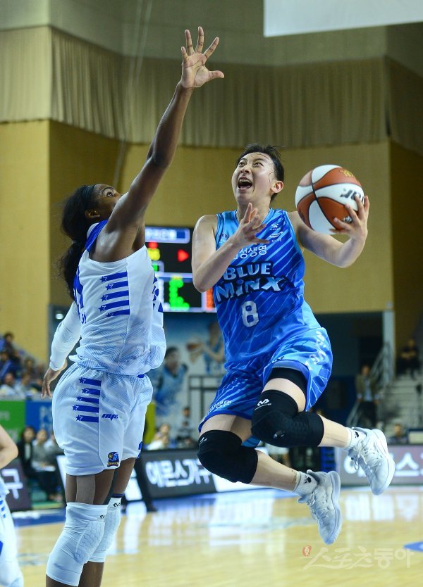 21일 경기도 용인실내체육관에서 열린 ‘하나원큐 2019-2020 여자프로농구’ 우리은행과 삼성생명 경기에서 삼성생명 이주연이 우리은행의 수비를 뚫고 골밑 슛을 하고 있다.