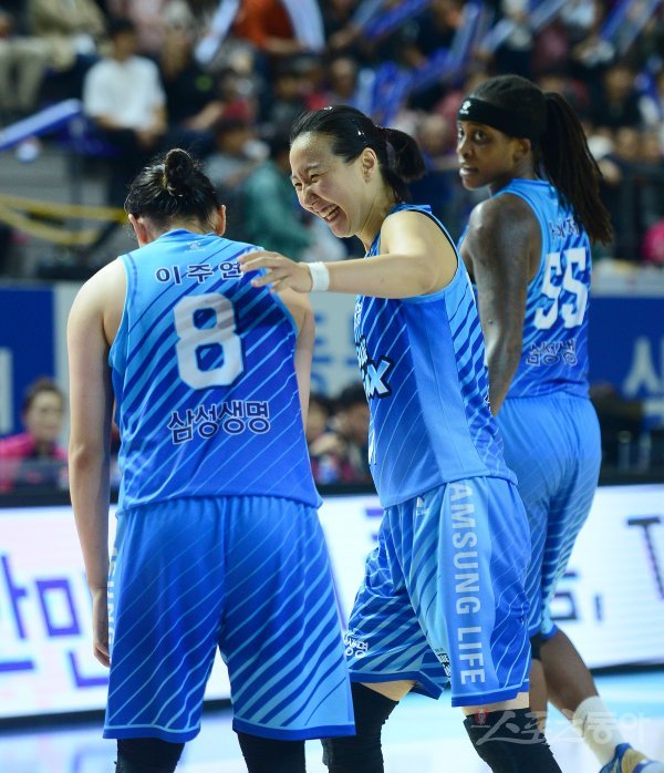 21일 경기도 용인실내체육관에서 열린 ‘하나원큐 2019-2020 여자프로농구’ 우리은행과 삼성생명 경기 4쿼터 삼성생명 이주연이 결정적인 슛을 성공시키자 김보미가 기뻐하고 있다.