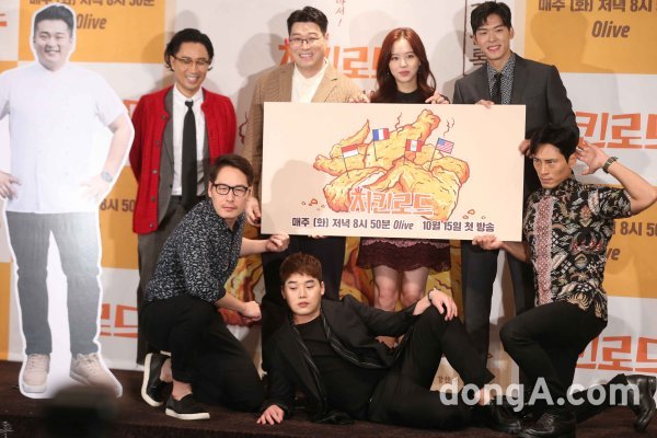 22일 오후 서울 영등포구 여의도 켄싱턴호텔에서 열린 올리브 채널 \'치킨로드\' 기자간담회에서 출연진이 참석해 포토타임을 하고 있다.