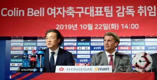 22일 서울 종로구 신문로 축구회관에서 열린 여자 축구대표팀 감독 취임식에서 김판곤 국가대표 감독 선임위원장이 선임 과정을 설명하고 있다.