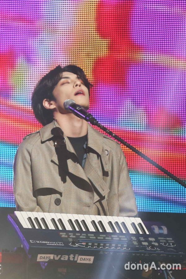 밴드 데이식스(DAY6)의 원필이 22일 오후 서울 광진구 예스24 라이브홀에서 열린 정규 3집 \'더 북 오브 어스 : 엔트로피(The Book Of Us: Entropy)\' 발매 기념 프레스 쇼케이스에서 공연을 선보이고 있다.