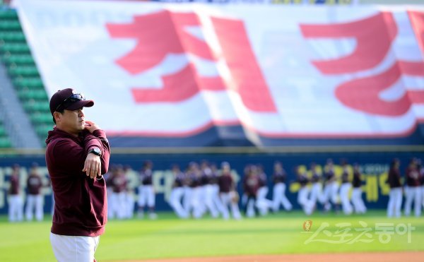 경기에 앞서 키움 장정석 감독이 훈련을 지켜보고 있다.