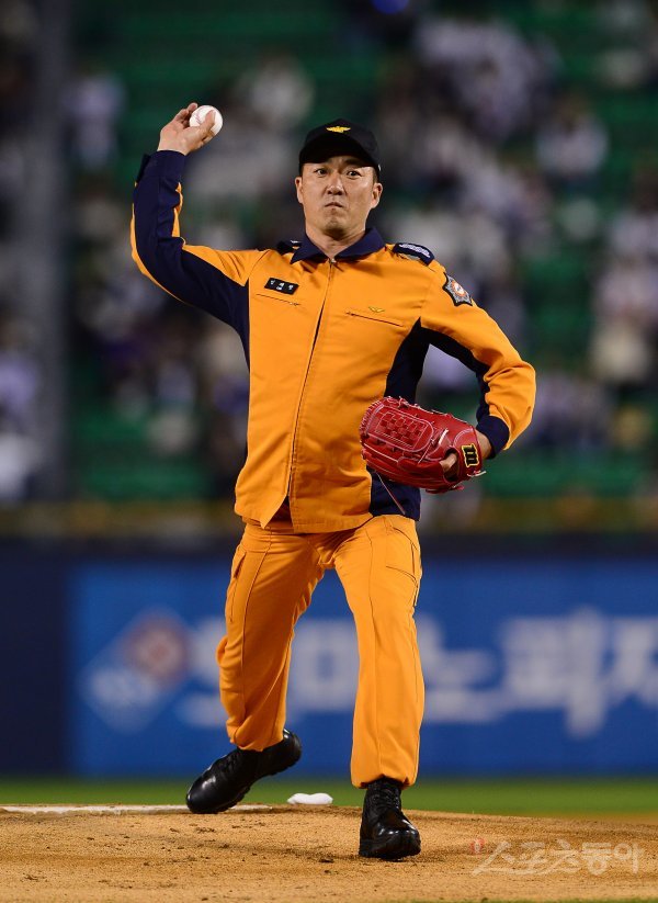 경기 전 열린 공식 시구행사에서 임채정 소방장이 힘차게 공을 던지고 있다.