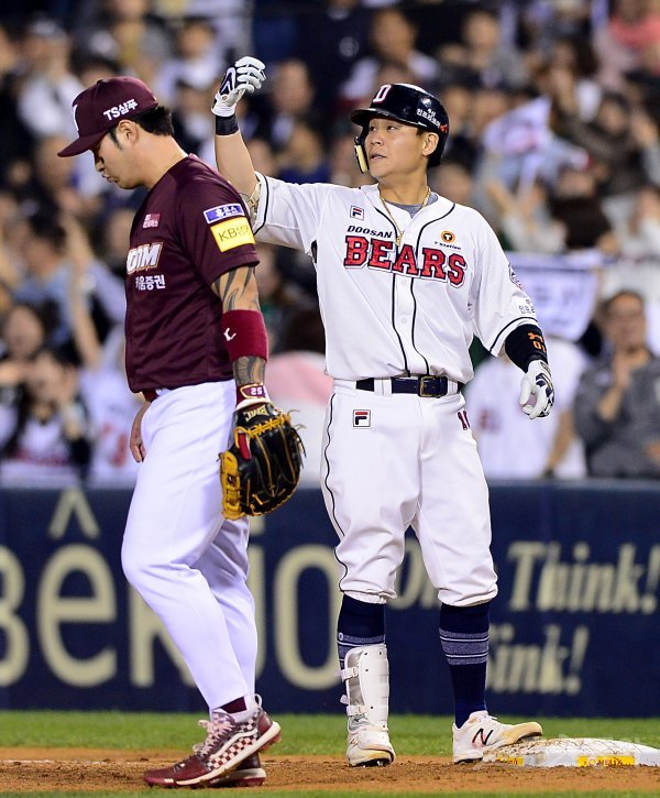 두산 박세혁이 2회말 1사 만루에서 역전 적시타를 친 후 덕아웃을 향해 세리머니를 하고 있다.