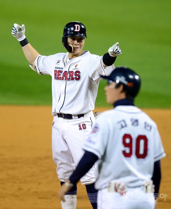 2회말 1사 만루 두산 박세혁이 역전 1타점 적시타를 치고 1루에서 기뻐하고 있다.