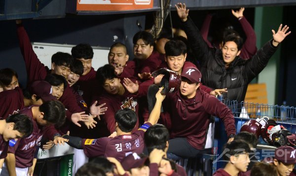 1회초 2사 2루 키움 박병호의 선제 1타점 적시타 때 득점한 김하성이 더그아웃에서 하이파이브하고 있다.