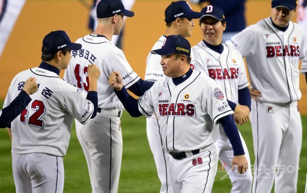 식전행사에서 두산 김태형 감독이 도열한 선수들과 하이파이브하고 있다.
