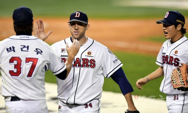 4회초 1사 만루에서 키움 김규민을 병살 아웃 시킨 두산 선발 린드블럼이 동료들과 기쁨을 나누고 있다.
