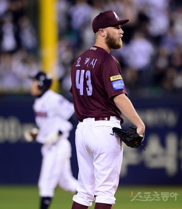 키움 선발 요키시가 4회말 무사 1루에서 보크를 허용한 후 아쉬워하고 있다.