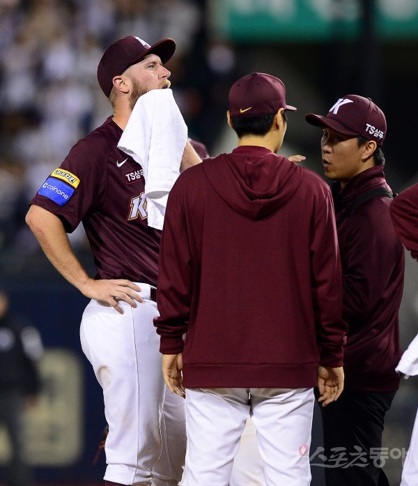 키움 선발 요키시가 4회말 2사 1루에서 상대 타자의 2루 도루 때 포수의 송구를 맞고 고통스러워하고 있다.