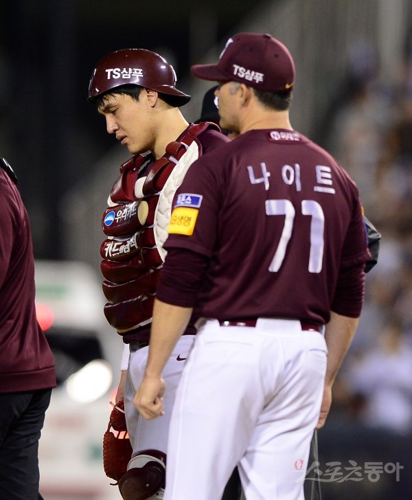 키움 포수 박동원이 4회말 2사 1루에서 상대 타자의 2루 도루 때 던진 송구가 선발 요키시가 맞고 부상을 당하자 고개를 떨구고 있다.