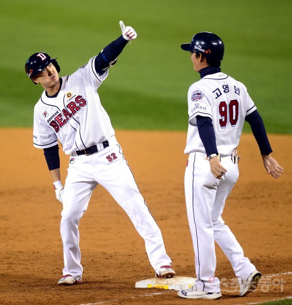 4회말 1사 3루 두산 김재호가 1타점 적시타를 치고 1루에서 기뻐하고 있다.