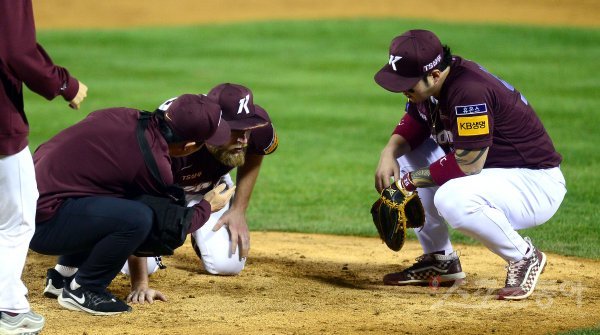4회말 2사 1루 두산 박건우 2루 도루 때 키움 선발 요키시가 송구된 공에 얼굴을 맞고 마운드에 쓰러져 있다.