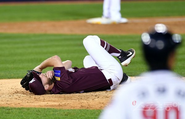 4회말 2사 1루에서 두산 정수빈 타석 때 1루 주자 박건우의 2루 도루 상황에서 키움 선발 요키시가 박동원의 송구에 맞아 그라운드에 쓰러져 있다.