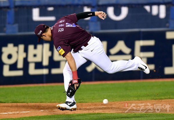 4회말 2사 2루에서 두산 박건우의 내야 땅볼 타구를 키움 김웅빈이 실책하고 있다.