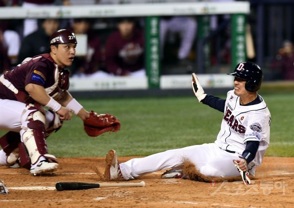 4회말 2사 2루에서 두산 박건우의 내야 땅볼 대 상대 실책으로 2루 주자 김재호가 득점에 성공하고 있다.