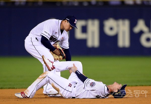 두산 김재호가 6회초 이닝을 마친 후 다리에 쥐가 올라와 고통스러워하고 있다.