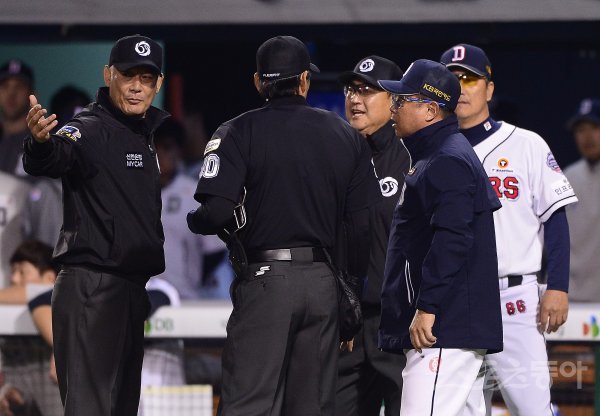 두산 김태형 감독이 9회말 무사 1,2루에서 페르난데스의 투수 앞 땅볼 때 쓰리피트 아웃으로 판정이 나자 심판에게 강하게 어필하고 있다.