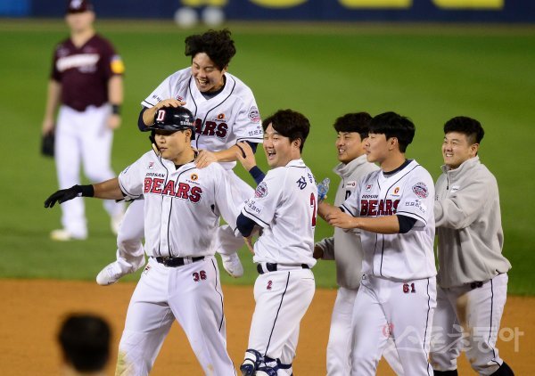 9회말 1사 만루 두산 오재일이 끝내기 안타를 치고 팀 동료들과 기뻐하고 있다.