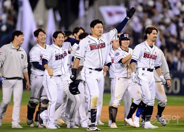 22일 서울 잠실야구장에서 열린 ‘2019 신한은행 MY CAR KBO 포스트시즌’ 한국시리즈 1차전 키움 히어로즈와 두산 베어스의 경기에서 두산이 9회말 오재일의 끝내기 안타에 힘입어 7-6으로 승리하며 첫 승을 신고했다.