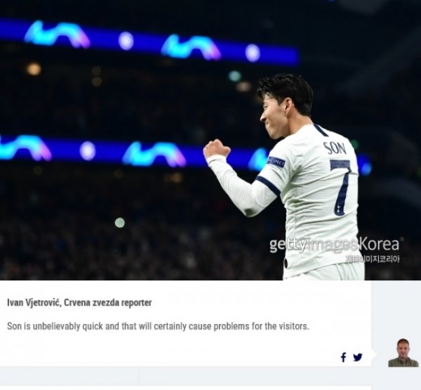 잉글랜드 프리미어리그(EPL) 토트넘 홋스퍼 공격수 손흥민의 맹활약에 즈베즈다 담당 기자도 감탄했다.