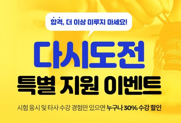 이에 종합교육기업 에듀윌(대표 박명규)은 불합격한 수험생을 위해 ‘다시 도전 특별 지원 이벤트’를 마련했다. 공인중개사 시험에 응시한 경험 및 타 공인중개사 시험 과정을 수강한 경험이 있으면 수강료의 30%를 할인받을 수 있다.