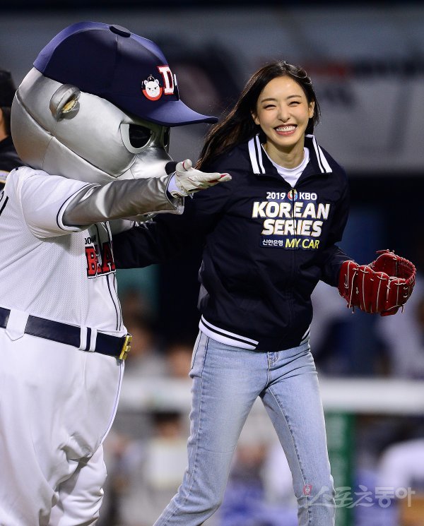 배우 이다희가 경기 전 열린 시구 행사를 마친 후 두산 마스코트와 웃으며 들어가고 있다.