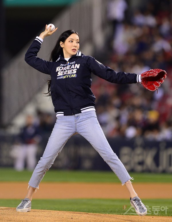 배우 이다희가 경기 전 열린 시구 행사에서 힘차게 공을 던지고 있다.
