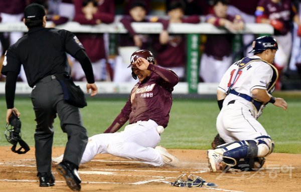 2회초 무사 3루에서 키움 김혜성의 희생플라이 때 3루 주자 송성문이 득점에 성공하고 있다.