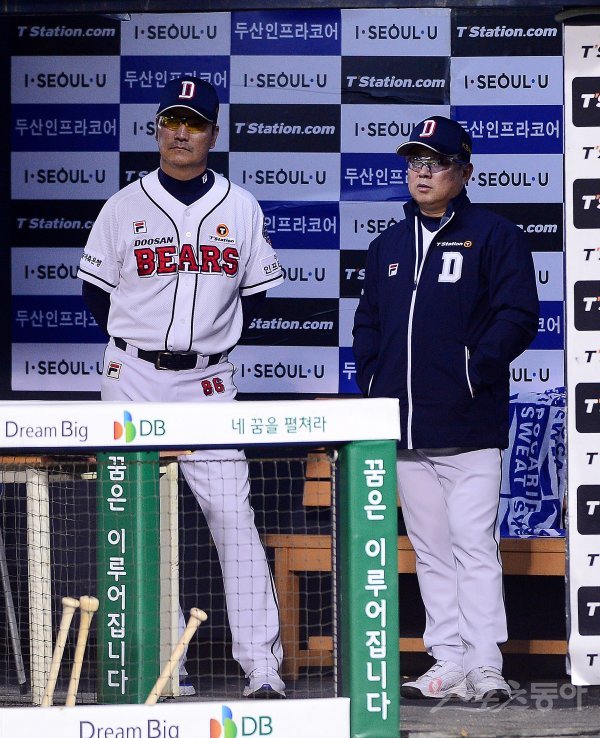 두산 강석천 코치와 김태형 감독(오른쪽)이 경기를 지켜보고 있다.