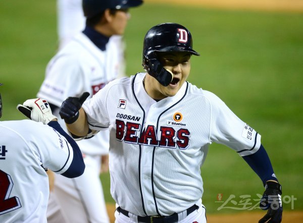 4회말 2사 1루 두산 오재일이 동점을 만드는 우중월 투런 홈런을 날리고 그라운드를 돌아 홈인해 하이파이브하고 있다.
