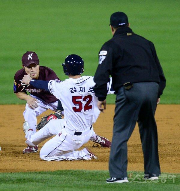 3회말 1사 1루 상황에서 1루주자 두산 김재호가 2루 도루를 시도했으나 아웃되고 있다.